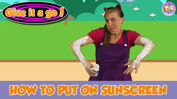 ☆ GIVE IT A GO – How to apply sunscreen ☆ Do you make sure you wear sunscreen when the sun is shining outside? Do you know how apply sunscreen to ensure you’re being sun smart? No? Well, we have just the video for you. In this episode of “Give it a Go”, Pevan gives Sarah step by step instructions on how to apply sunscreen. Follow along as Sarah learns that it’s really not that difficult after all. Maybe you could even try to apply sunscreen all by yourself? Remember, all you have to do is…GIVE IT A GO!